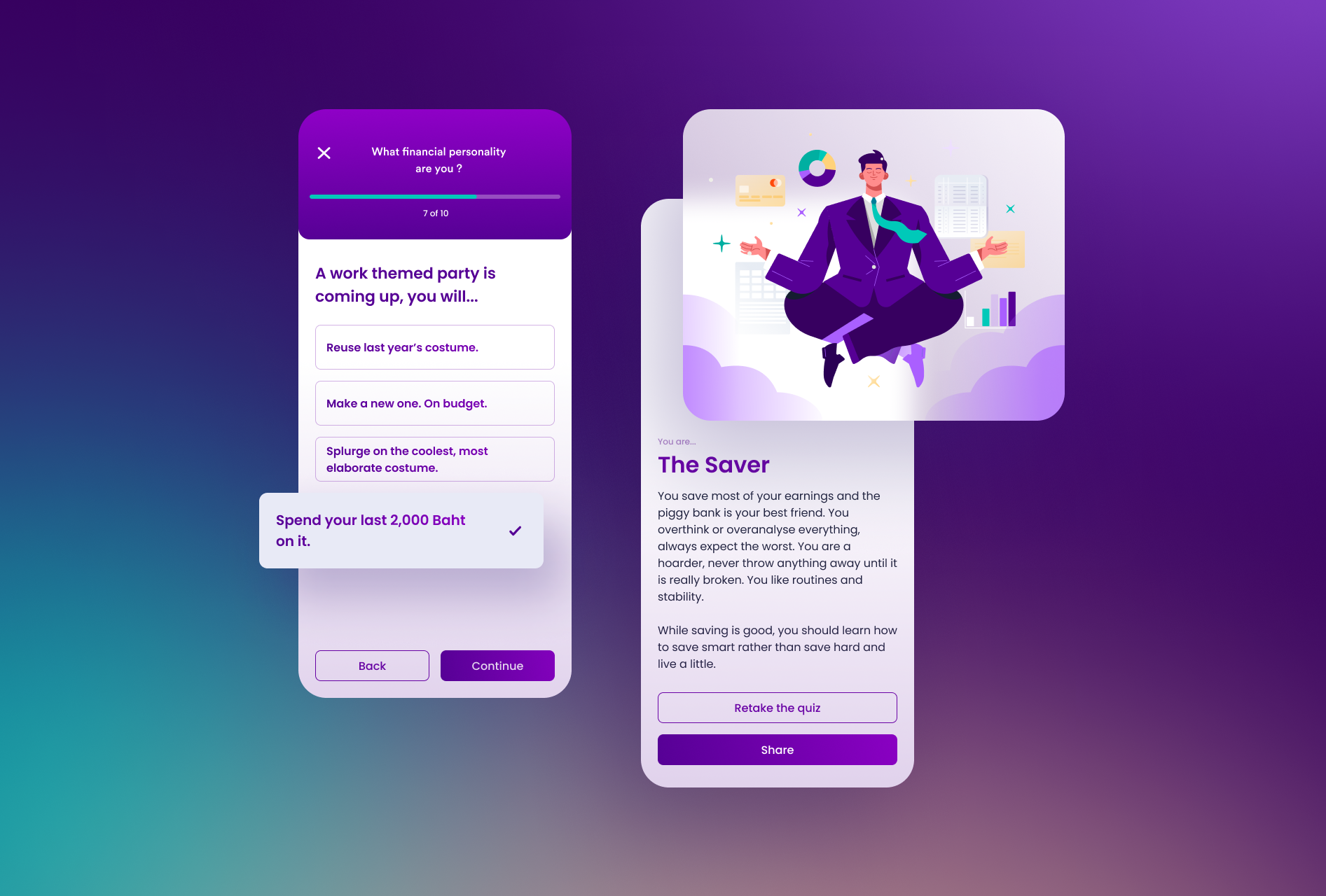 Therefore, this feature is introduced to give some hints on why the applicants got rejected. Using the Gamification approach, the users will be given a short quiz to evaluate what financial personalities are they, and how can they improve their financial wealth further.