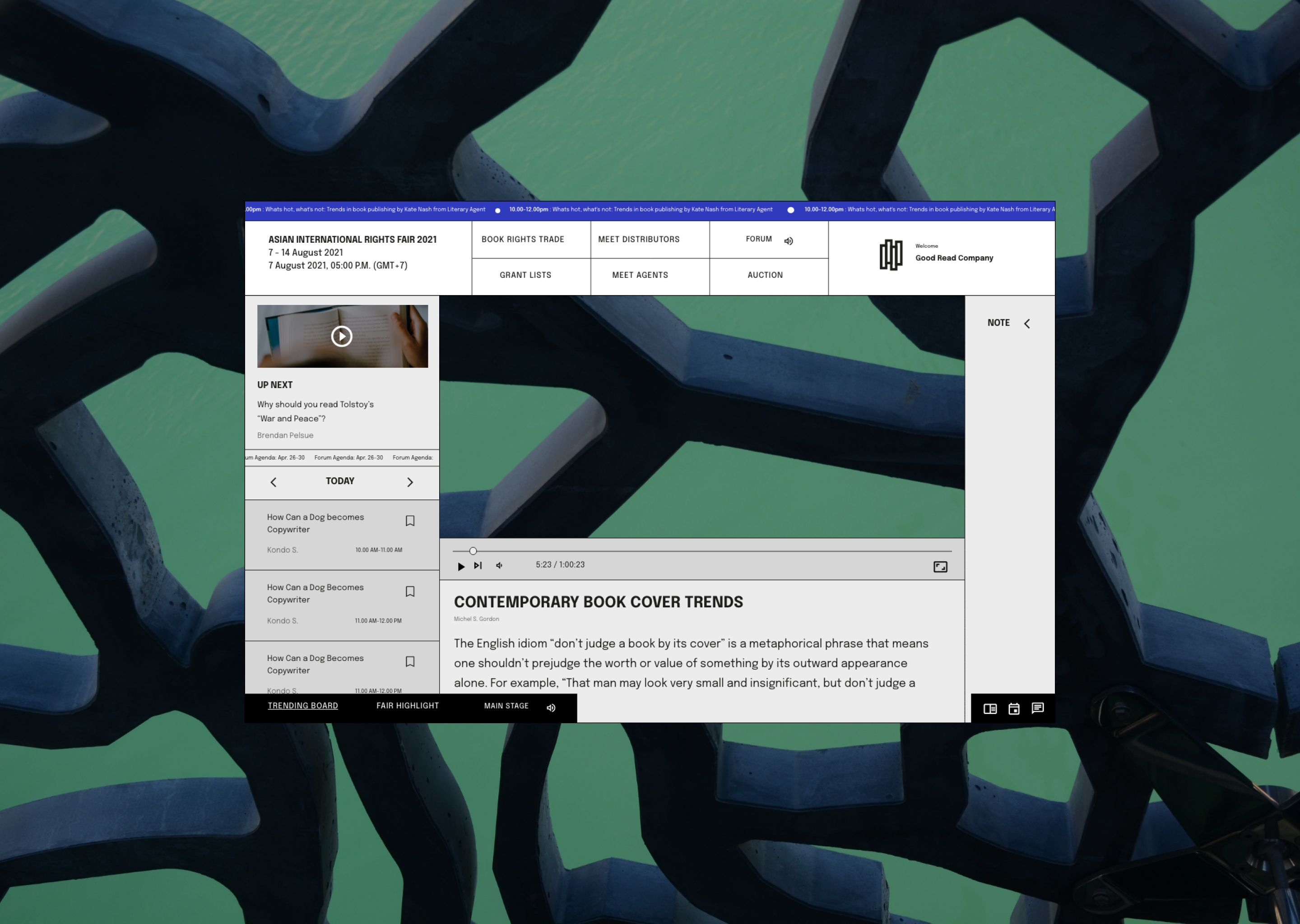 Within a small team of designers and project manager, I lead and develop an Interface design in rapid iterations to mimic the real experience of a book fair. As a result, the platform provides a fully immersive experience to every stakeholder from book dealers, publishers, and press to buyers with features including book rights trading, fair ticket buying, and online book seminar scheduling.
